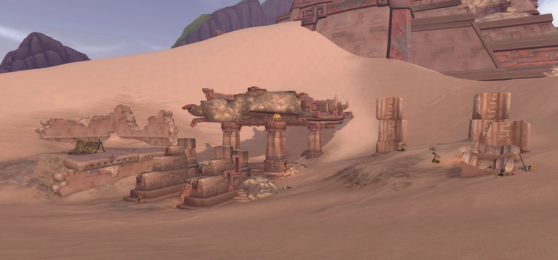 The Sandfury Hideout is a Sandfury troll camp established in a troll ruin in the dunes immediately north of Atul'Aman in central Vol'dun.[47, 58.6] Led by Gozda'kun the Slaver, the Sandfury bandits here ransacked the Goldtusk Inn, kidnapped members of the Goldtusk Gang, and mocked the inn's owner Rhan'ka with an assortment of fruits and vegetables, leading Rhan'ka to ask adventurers to travel to the hideout, kill Gozda'kun, and rescue the gang members.[1][2]