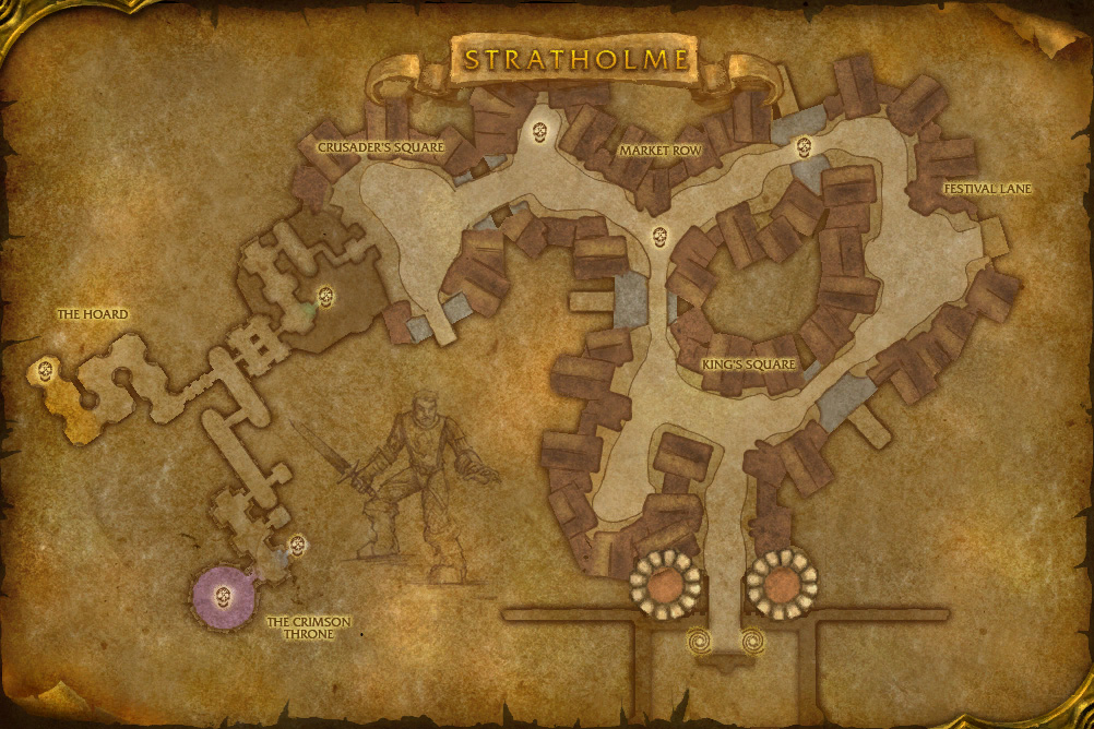 The Scarlet Bastion serves as a small outpost in the undead-infested city of Stratholme. Grand Crusader Dathrohan struggles to hold the Scarlet Crusade stronghold. He coordinates the fight for control of the ravaged city. It is manned by members of the Crimson Legion, the elite guard of the Crusade. It is the Scarlet Crusade's holiest site. The Scarlet Bastion is where the Scarlet Crusade first formed, and where the founding members took their oaths.[4]