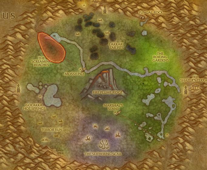 The Screaming Reaches is the region in northwestern Un'Goro Crater, just west of Mossy Pile. This appropriately named area is filled with screeching pterrordax. In the far northwestern part of this area is another ramp,[29, 22] similar to the one used to enter Un'Goro, that exits into Silithus.