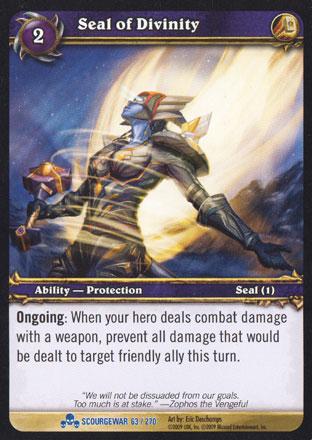 | Rules | Ongoing: When your hero deals combat damage with a weapon, prevent all damage that would be dealt to target friendly ally this turn. |