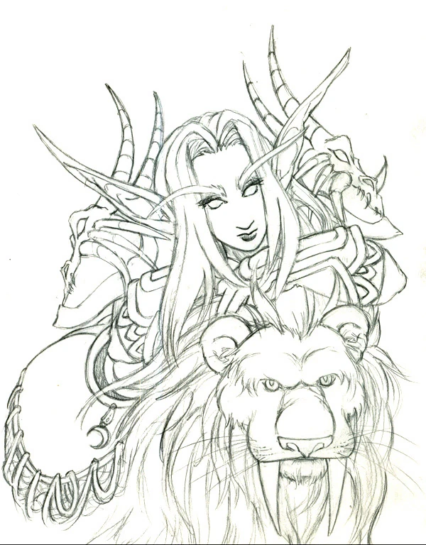 She will readily weaken her opponents before they draw near with shots and stings from her trusted bow to slow their advance and lure them into traps. However, should things become dire the two fly into a rage, sharing one another's will, strength and aggression. When fighting this way they unleash their claws, arrows, fangs and blades upon their opponents and become an prime example of the savage Sentinel and beast that humans so feared during first contact with the Kaldorei long ago.