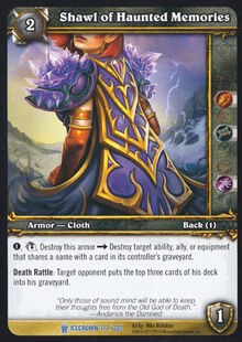 | Rules | 1, [Activate] , Destroy this armor --> Destroy target ability, ally, or equipment that shares a name with a card in its controller's graveyard. Death Rattle: Target opponent puts the top three cards of his deck into his graveyard. |