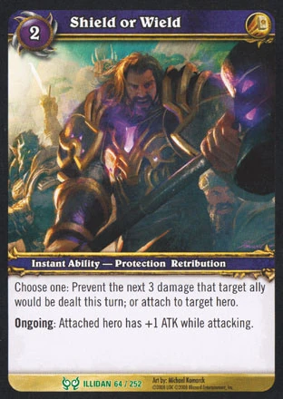 Choose one: Prevent the next 3 damage that target ally would be dealt this turn; or attach to target hero. Ongoing: Attached hero has +1 ATK while attacking. |