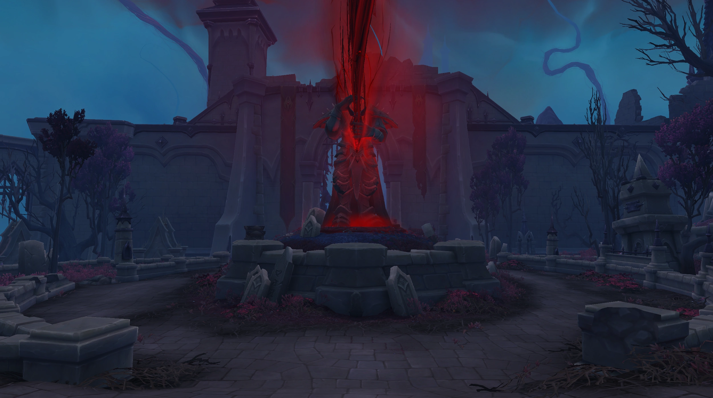 Sinstones laid around a statue of Sire Denathrius at Pridefall Hamlet