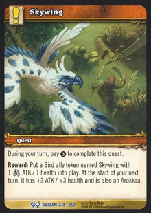 During your turn, pay (3) to complete this quest. Reward: Put a Bird ally token named Skywing with 1 Melee ATK / 1 health into play. At the start of your next turn, it has +3 ATK / +3 health and is also an Arakkoa. |