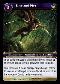 As an additional cost to play Slice and Dice, remove up to five Combo cards in your graveyard from the game. Your hero deals X melee damage divided as you choose to any number of target heroes and/or allies, where X is the number of Combo cards you removed. |