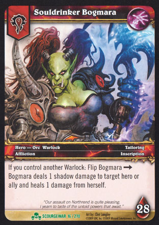 | Rules | If you control another Warlock: Flip Bogmara → Bogmara deals 1 shadow damage to target hero or ally and heals 1 damage from herself. |