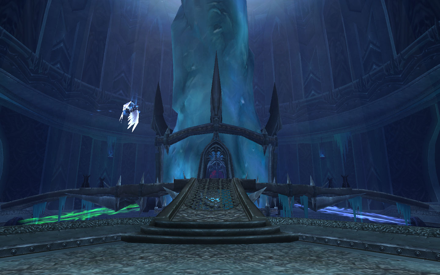 The Spire connects the Plagueworks, the Crimson Hall and Frostwing Halls in the middle level of Icecrown Citadel surrounding the Frozen Throne. Val'kyr Heralds circle the area, patrolling for intruders. At its base, Lord Marrowgar stands vigil, waiting to kill any intruders who dare attempt to enter his master's sanctum.
