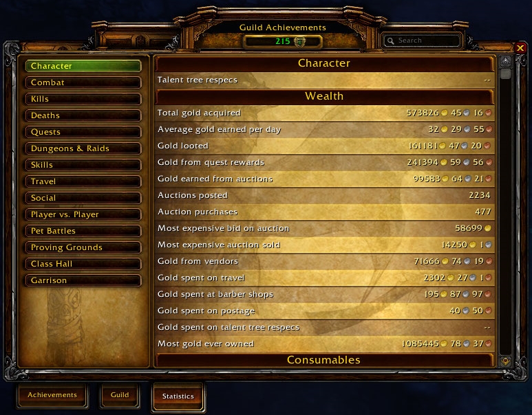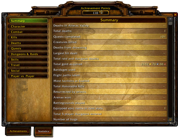 The Statistics panel is accessible via a bottom tab from the Achievements panel. It shows lists of statistics based on a variety of things a player can do while in the game. These can range from the amount of gold owned to a number of deaths by Hogger. Unlike Achievements, statistics have no points and are purely for informational needs.
