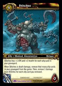 Stitches has +1 ATK and +1 health for each ally card in your graveyard. When Stitches is dealt damage, remove that many ally cards in your graveyard from the game. Then, remove 1 damage from Stitches for each ally card you removed. |