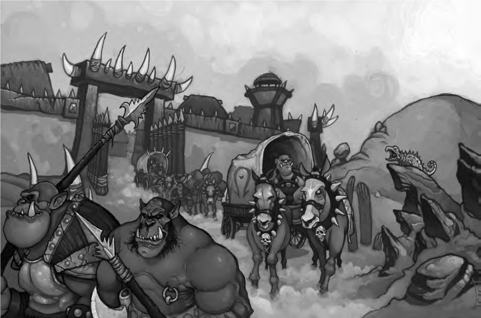 It is protected by 8-foot walls, and sentries watch every gate. Although there is little traffic through the swamps, the orcs must guard against Alliance attacks. They send caravans to their allies in Stranglethorn Vale to trade for supplies twice a year, though the town does boast several weaponsmiths who create beautiful weapons with the ore they trade for.