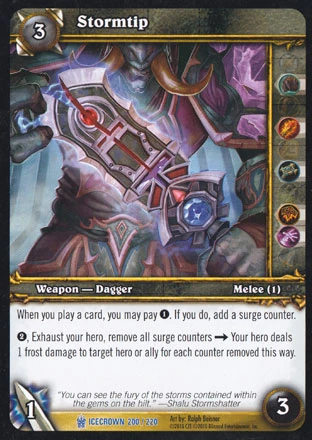 | Rules | When you play a card, you may pay 1. If you do, add a surge counter. 2, Exhaust your hero, remove all surge counters --> Your hero deals 1 frost damage to target hero or ally for each counter removed this way. |