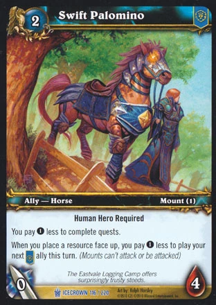 | Rules | Human Hero Required You pay 1 less to complete quests. When you place a resource face up, you pay 1 less to play your next [Alliance] ally this turn. (Mounts can't attack or be attacked. |