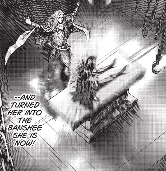 In truth, as Sylvanas lay dying after being impaled by Frostmourne, she told Arthas to finish her, saying she deserved a clean death. Having had to fight her every step of the way, Arthas responded by telling her the last thing he would give her was the peace of death. Moments after Sylvanas passed away into a comforting darkness, she felt agony unlike any she had ever known. Arthas ripped her soul back into the world and Sylvanas Windrunner became the first of the high elven banshees.[25] Frostmourne fractured her soul, consuming a fragment of it and leaving that part frozen in time while the rest of her continued onward.[26] As a banshee, she was able to give voice to her pain, and in so doing she would cause pain to others. Her body was flung onto a meatwagon, lost among the thousands more the Scourge had claimed, and would later be locked in an iron coffin as a further act of vengeance upon the ranger-general.[25]