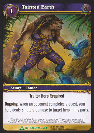 Traitor Hero Required Ongoing: When an opponent completes a quest, your hero deals 3 nature damage to target hero in his party. |