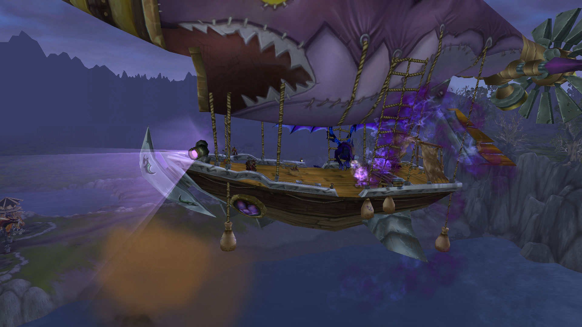 The Spear of Durotar is the flagship of the air fleet that Garrosh Hellscream sends to the Twilight Highlands. Horde players board at the Southern Rocketway Terminus in Azshara and ride it in the Twilight Skies quest.