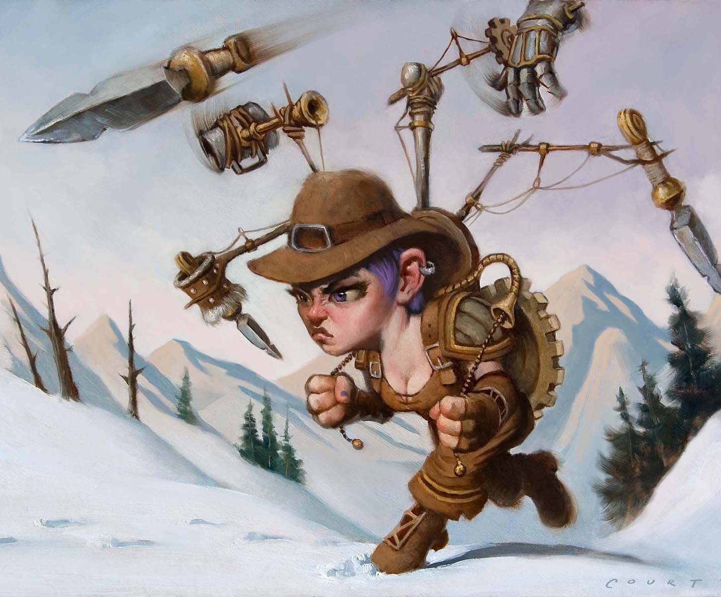 The iconic goblin inventor grins madly through a leather cap and soot-covered goggles. Devices of all sorts are strapped across his body, many of which look broken. He brandishes… something… to threaten his opponents.[7] Goblin tinkers can speak Common, Dwarven, Goblin, Low Common, and Orcish.[8]