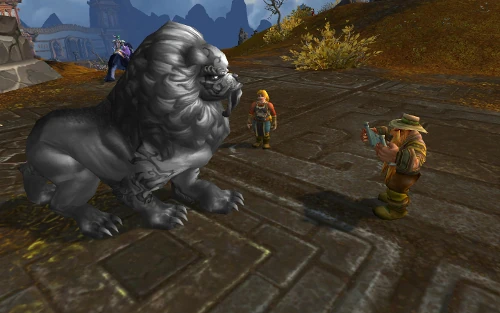 Fennie drops players off just outside of Mogujia, where elite Sentinel Strikers and Shieldwall Explorers are camped out. Brann Bronzebeard and Hilda Hornswaggle are looking at a quilen statue, while Silent Tosi and Penni Whitepetal are further northeast, offering repairs and food and drink, respectively. Turn in to Brann. Hilda and Sarannha Skyglaive, next to Tosi and Penni, offer followups.