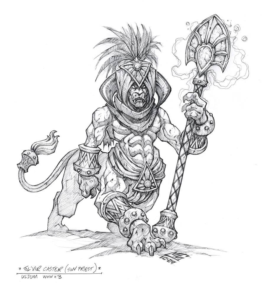 Like most other titan-forged, the tol'vir were created using the Forge of Wills during the ordering of Azeroth. Like the anubisaths and the mogu, many tol'vir accompanied Highkeeper Ra when he traveled south from Ulduar to install the Forge of Origination in the jungles of Uldum, far to the south. After the Forge had been embedded in the land, Ra assigned the tol'vir and anubisaths to watch over the area as he and the rest of his followers continued west to establish the fortress of Ahn'Qiraj.[2] When Ra vanished many years later, most of the tol'vir congregated around Uldum and began developing their own culture, completely separate from that of their northern brethren. When the agents of the treacherous Loken traveled south in search of Ra, they unwittingly afflicted the tol'vir with the Curse of Flesh.[3]