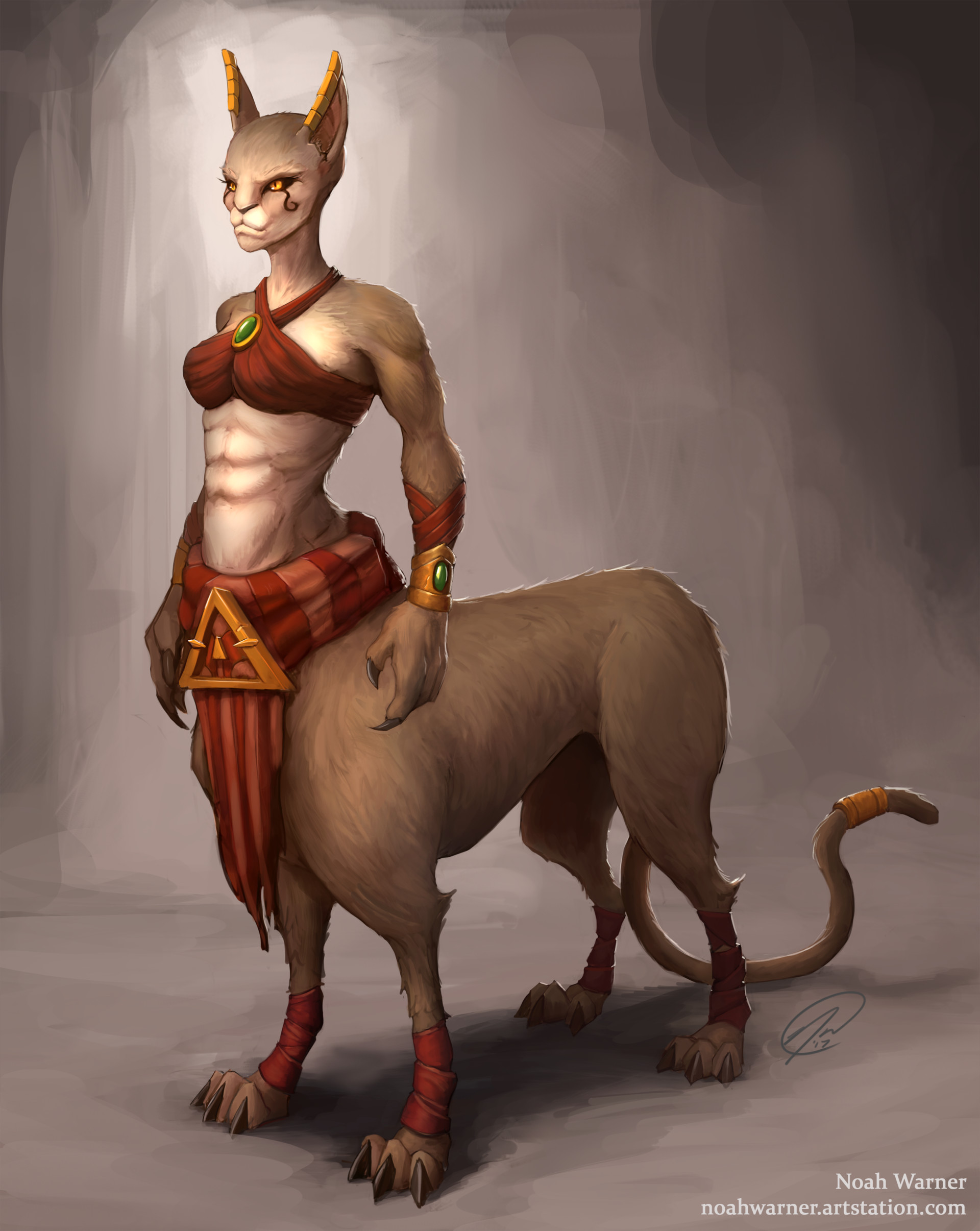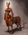 The tol'vir have humanoid upper torsos with a more leonine bottom half. Their faces are also very leonine, with sleek features and sharp fangs. Thick fur of various shading covers their body, with some tol'vir resembling tigers or jaguars, others having an appearance closer to that of lions or panthers.
