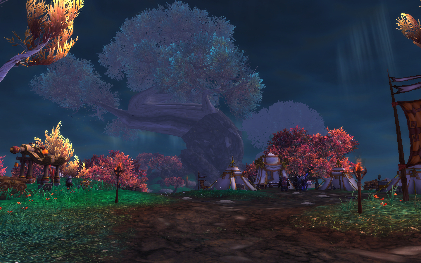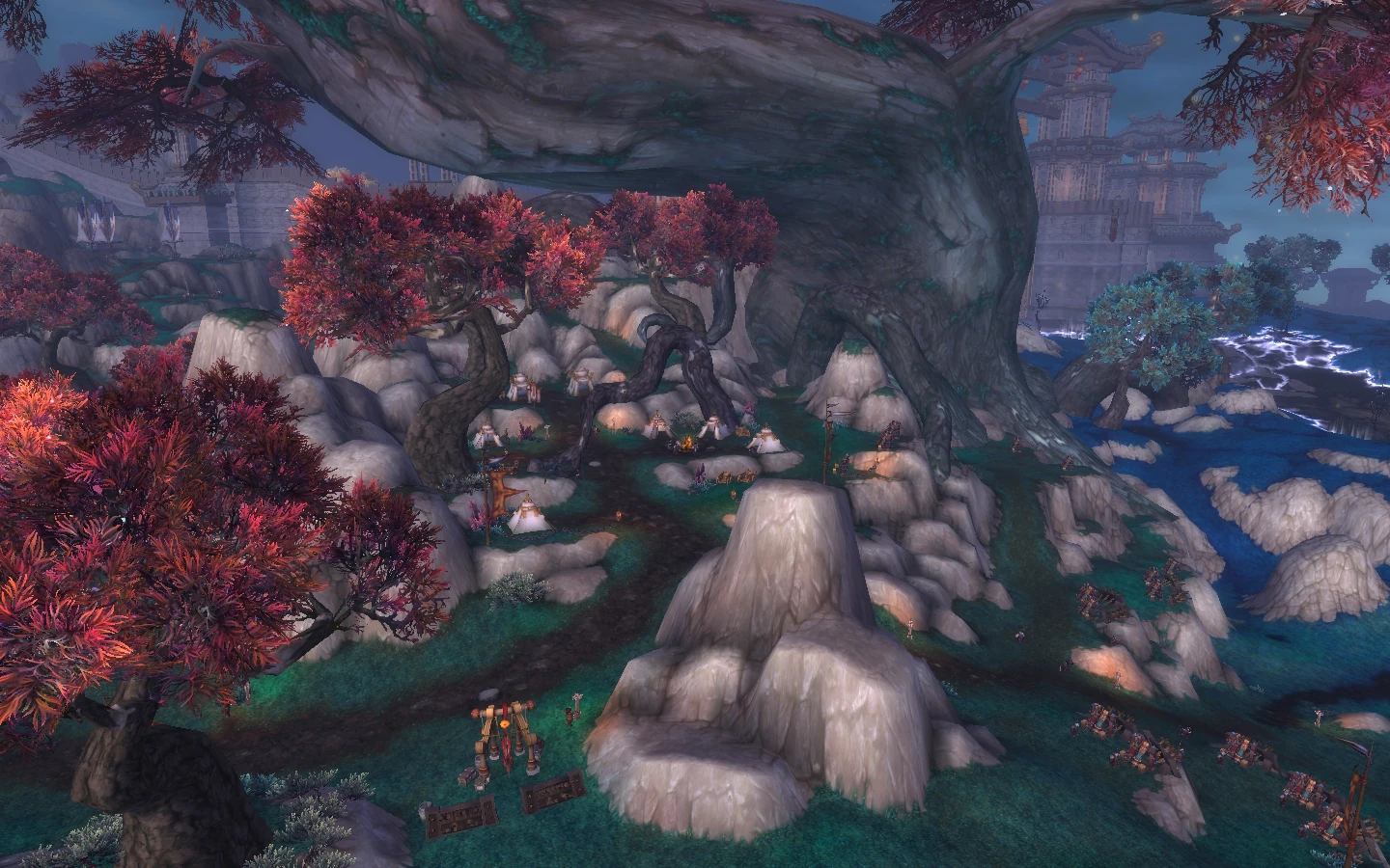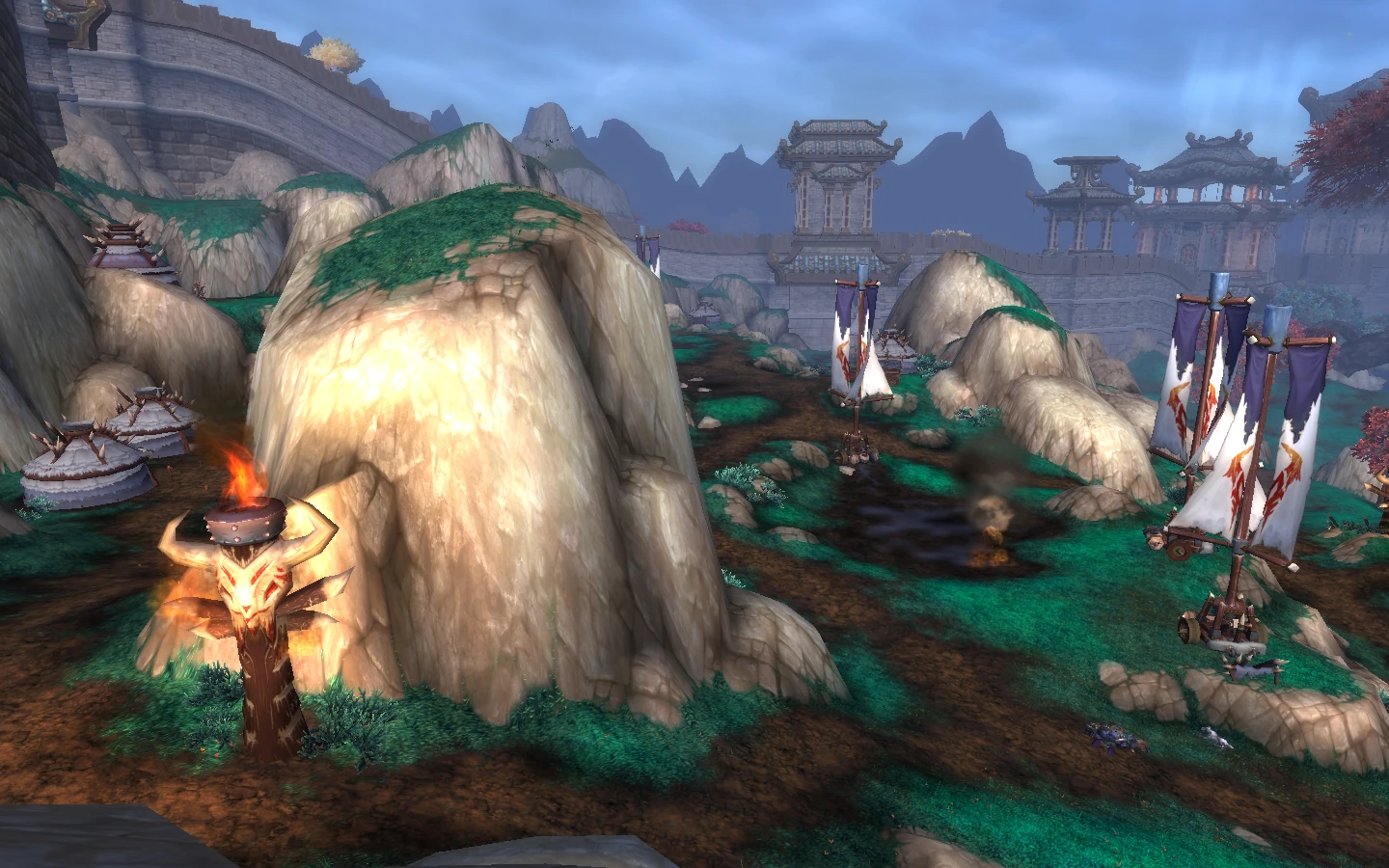 Just on the other side of the wall are Fire Camp Osul and the Longying Outpost, the latter of which was recently taken by the Shado-Pan to serve as a base. Suna Silentstrike, Ban Bearheart, Taoshi, and Taran Zhu, cleansed of his sha corruption, are having a war conference around a bonfire.