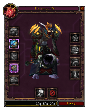 Once you are happy with the appearance, press 'Apply' to apply all selected transmogs (and/or reversions), for the stated price in gold.
