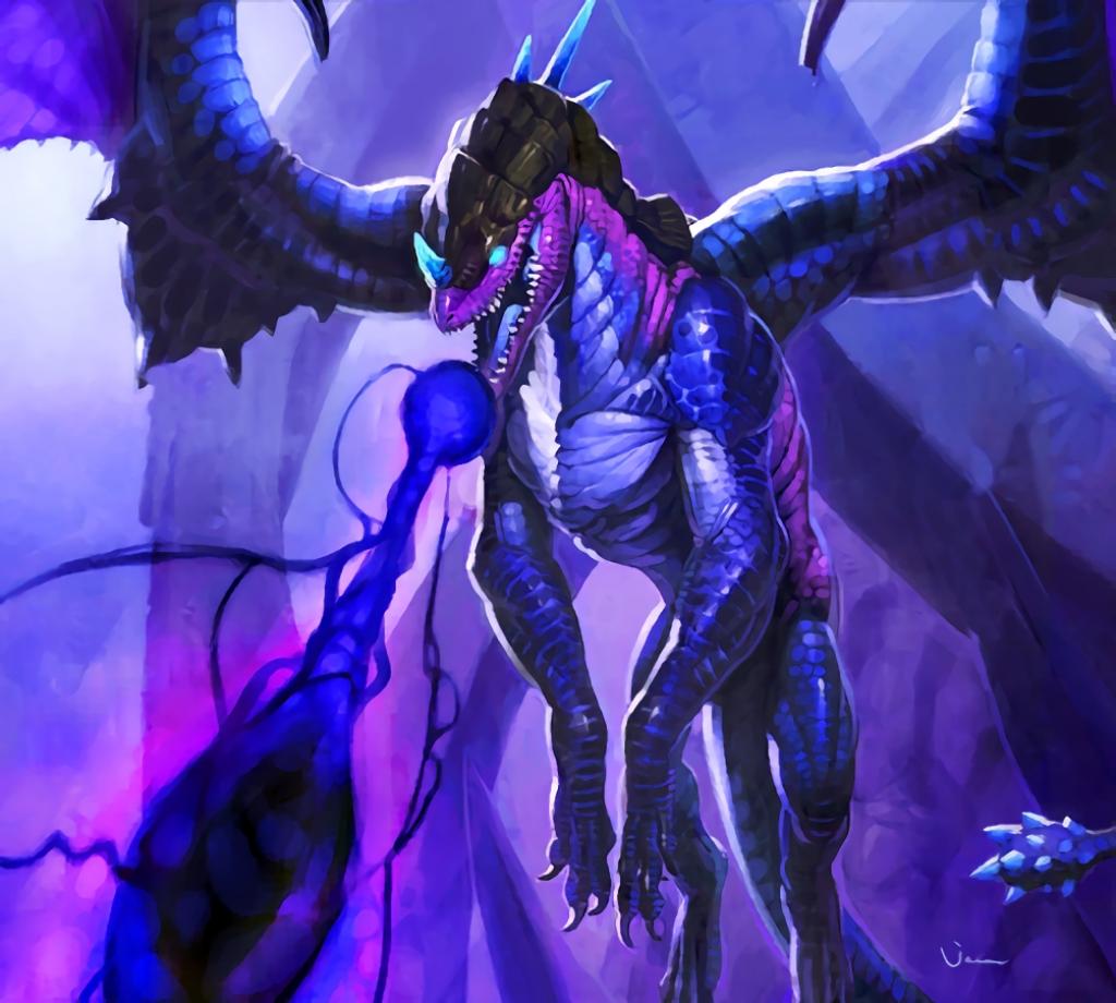 Twilight dragons resemble black dragons, but they glow with a greenish, red, or, more commonly, amethyst light. The earliest twilight dragons created by Sintharia had the ability to feed off of magical energy, particularly enemy dragons. The later dragons, those raised by Deathwing, may have similar abilities.