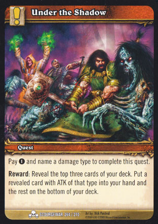 Pay (1) and name a damage type to complete this quest. Reward: Reveal the top three cards of your deck. Put a revealed card with ATK of that type into your hand and the rest on the bottom of your deck. |