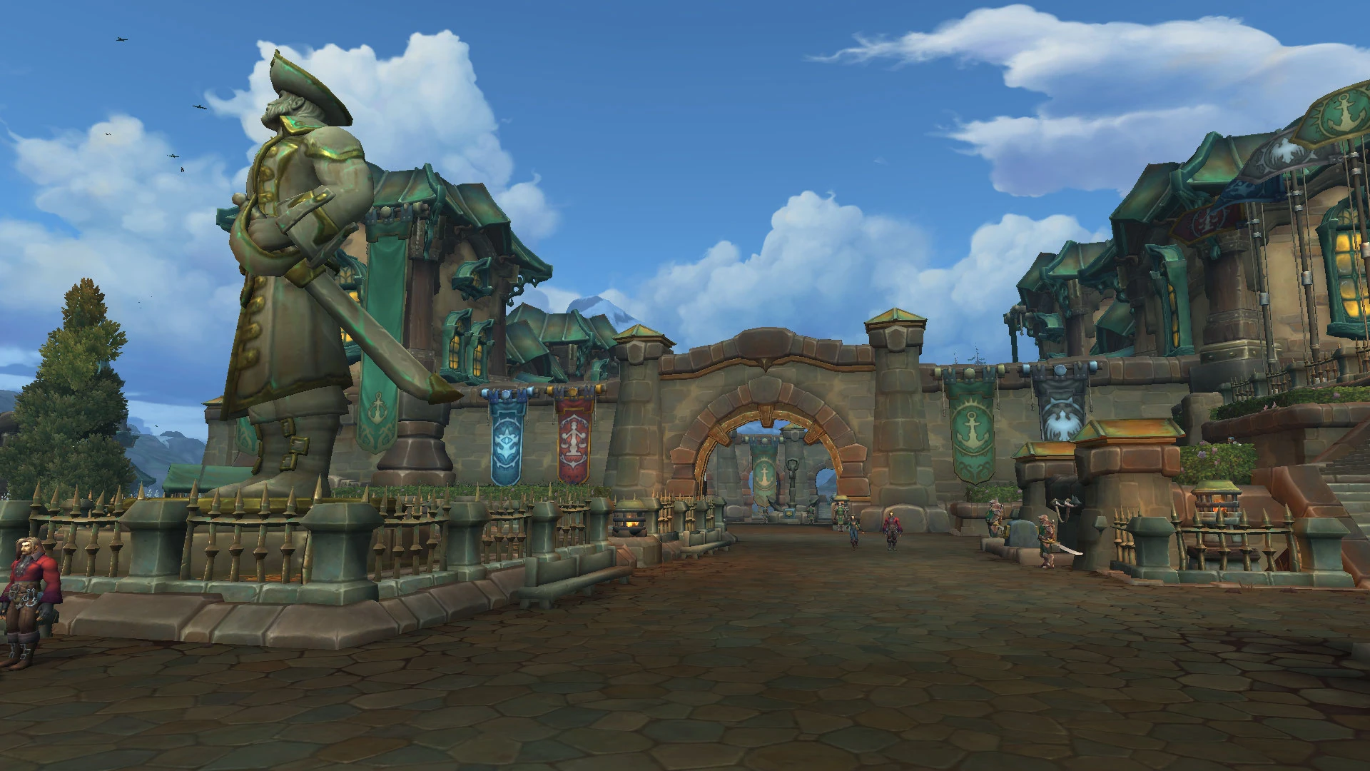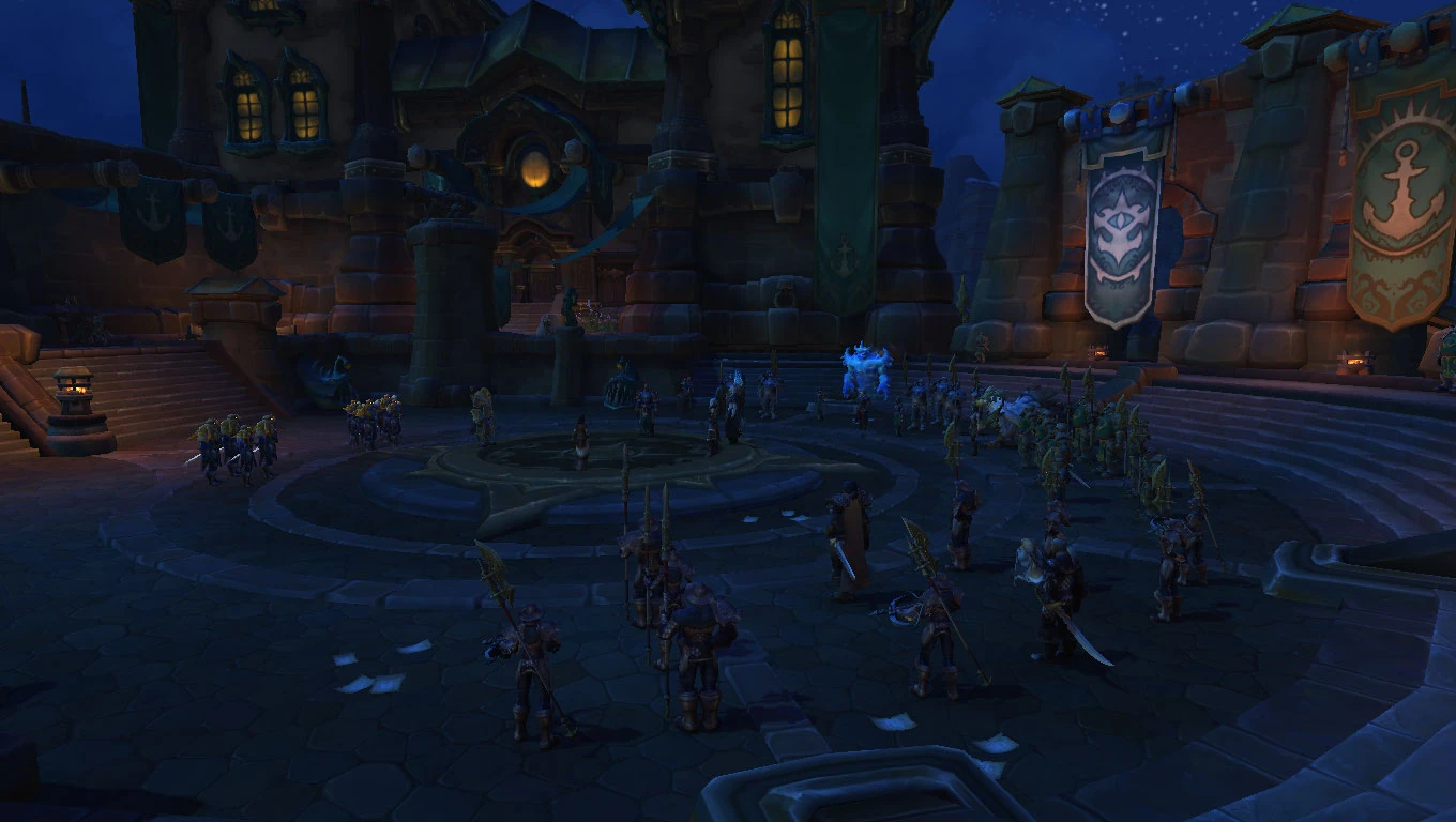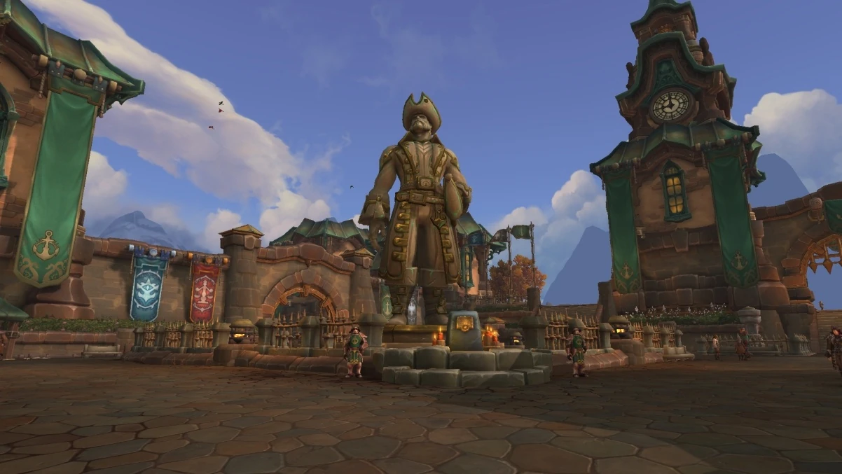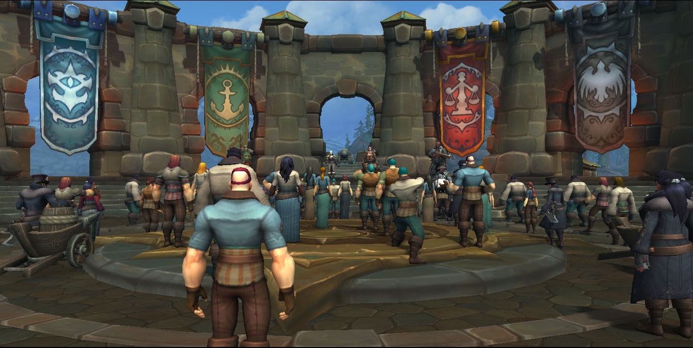 Unity Square is a large plaza located on the south side of the Kul Tiran capital city of Boralus. Sitting just off Proudmoore Keep, the square celebrates the unity of the kingdom's four ruling houses: Proudmoore, Ashvane, Waycrest, and Stormsong. At its center stands a large statue and memorial to Daelin Proudmoore, the late Lord Admiral of Kul Tiras, constructed following his death at Theramore. The square and its surrounding spaces serves as a major meeting place in the city, as well as a location for important ceremonies and addresses.
