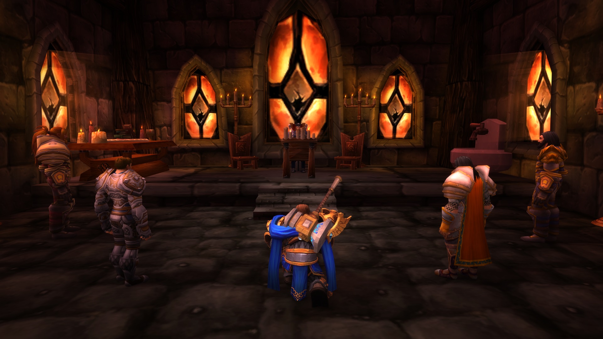 After the Horde's defeat at the end of the Second War, Uther along with Turalyon and the Knights of the Silver Hand were stationed in Stormwind City with their main base being the Cathedral of Light. The city was still being rebuilt after the First War, and the Cathedral was one of the few places complete. There Uther helped the sick, injured, orphaned, old and occasionally helped women give birth. Even Alleria shared a tease about the paladins being reduced to 'nurses'.[24]