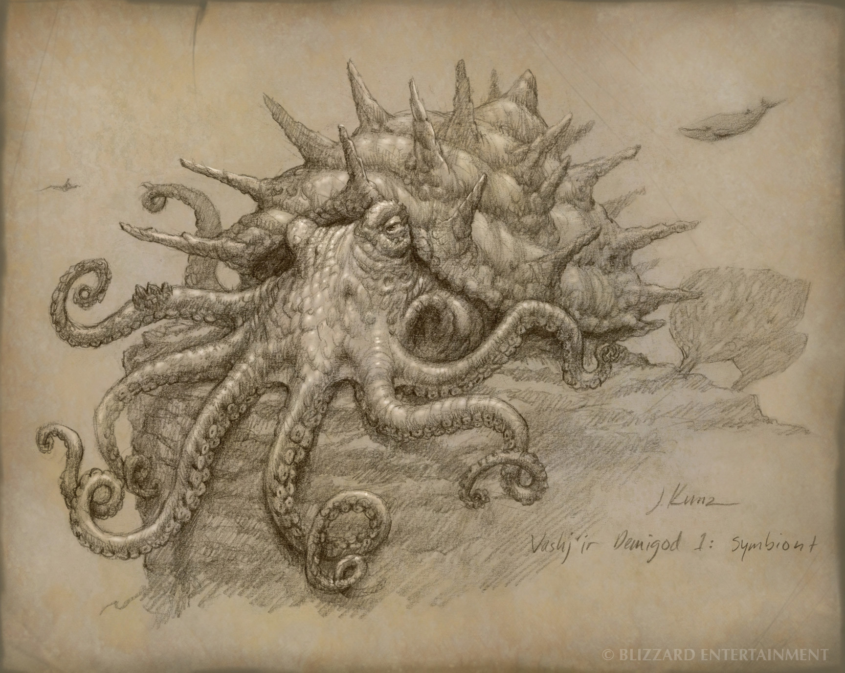There are two underwater demigods known as ancients in Vashj'ir.[1][2][3][4][5] They have a lot of internal room inside of their shells, within which their brains and two hearts are exposed. Their well-being seems to be tied to the health of the surrounding reefs. It is unclear exactly how they're related to the Ancient Guardians, if at all.