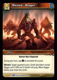 Human Hero Required During your turn, pay (1) to complete this quest. Reward: Target opponent puts a Gnoll ally token named Hogger with 2 ATK and 2 health into play. When Hogger leaves play, draw two cards. |