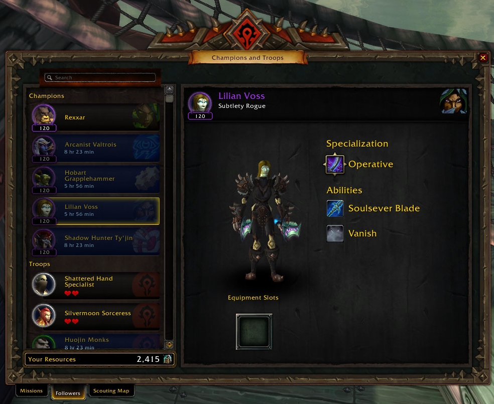 The following is a list of and information about followers in Battle for Azeroth. The followers can be accessed via the Missions report button and the Mission Command Table on your War Campaign Ship. Thematically, they are well-known characters.