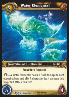 Frost Hero Required Activate → Water Elemental deals 1 frost damage to each opposing hero and ally. A character dealt damage this way can't attack this turn. |