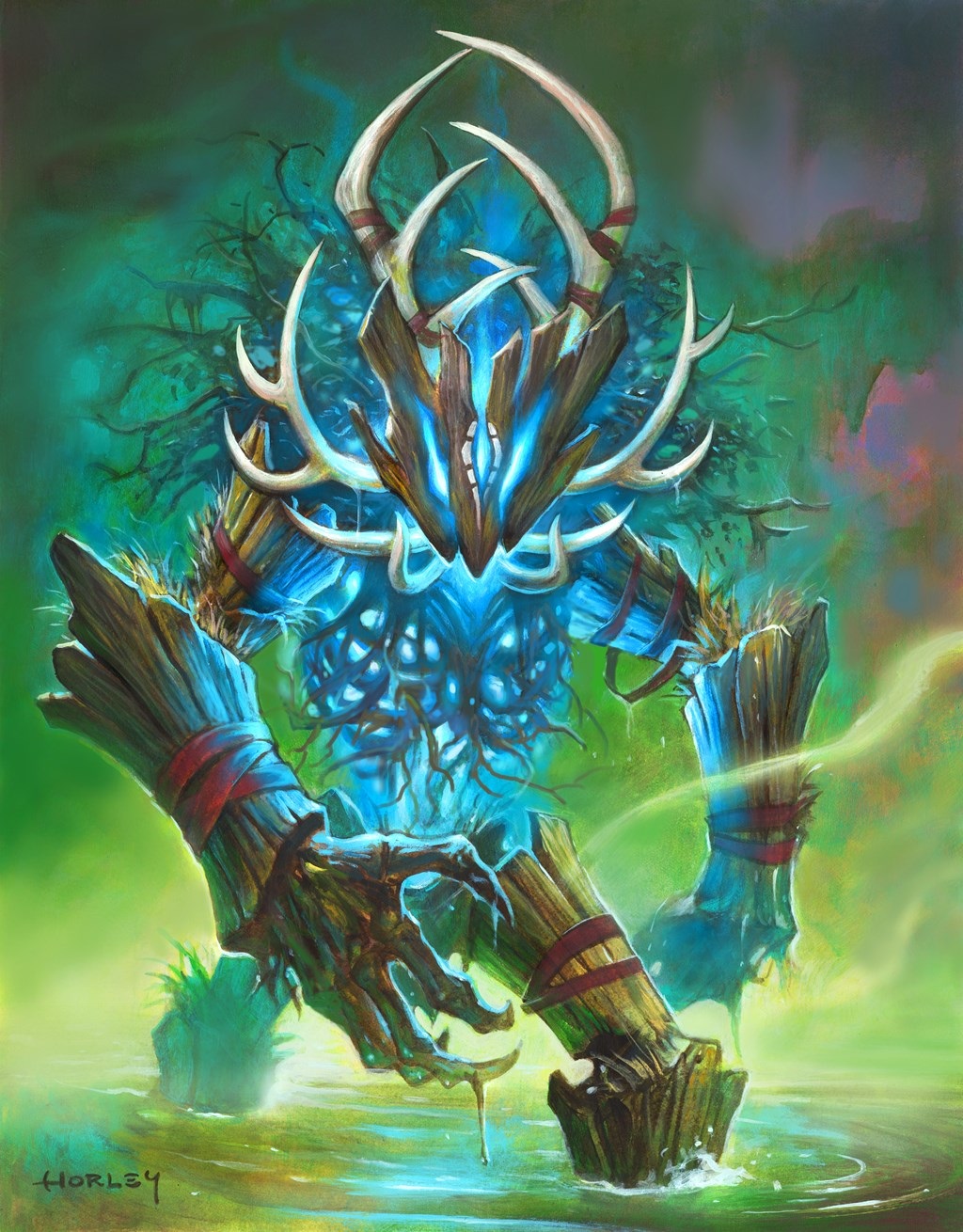 The wicker constructs are created by the Heartsbane Coven from dead objects such as wood, flesh, fur and bones,[1][2][3] and animated by ancient Drust death magic.[3] They are powered by the souls of human victims[4] or by the spirits of ancient Drust which are thus given physical forms. The witches of the coven control the wicker creatures with charms.[1][5] The strongest charms are in the hearts of the wicker creatures, pulsing like heartbeats,[6] and are used to anchor their spirits.[1] Some of the souls are still aware that they are inside the golems.[7][8] It is hard to tell where the bone parts of a wicker creature end and where the wood parts begin.[9]