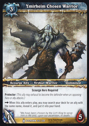 | Rules | Scourge Hero Required Protector --> When this ally enters play, you may search your deck for an ally with the same name, reveal it and put it into your hand. |
