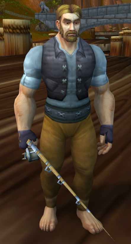 Zem Leeward is a human standing with a fishing pole, near the fishing trainer on one of the docks in Lakeshire in the Redridge Mountains.